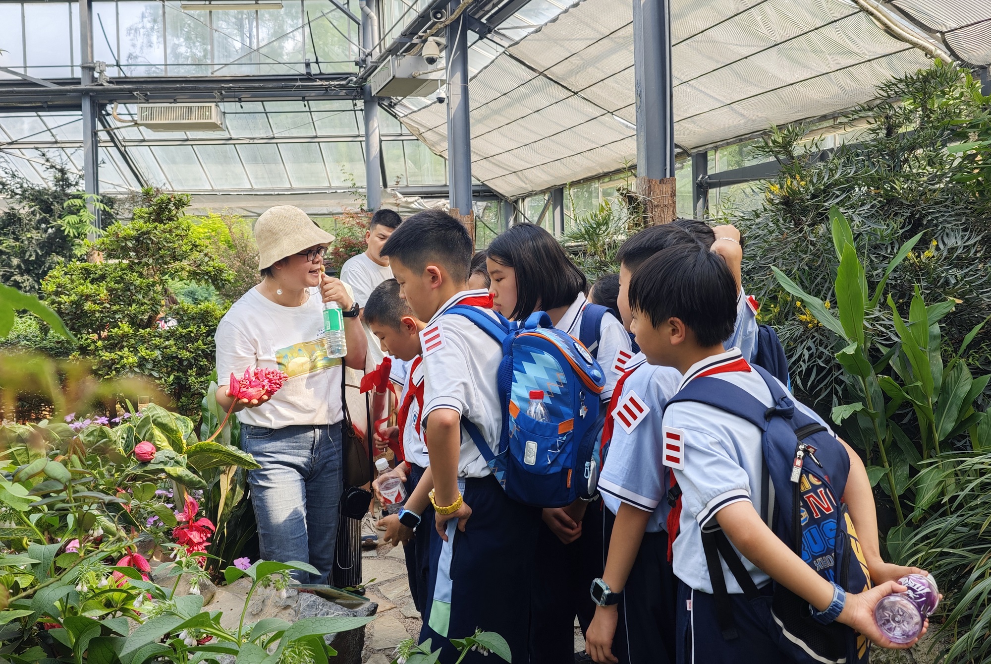 啟動儀式上,師生們分組參與了植物栽種活動,親手種下芳香植物幼苗,并認養了專屬地塊。學生們在園藝師的指導下學習栽培技巧,感受生命成長的喜悅,進一步理解了生物多樣性保護的意義;在科普師的帶領下參觀了華南植物園溫室群,近距離觀察了熱帶雨林植物、沙漠多肉等特色物種,了解了不同生態環境下植物的適應機制,上了一堂沉浸式的“自然科普課”。