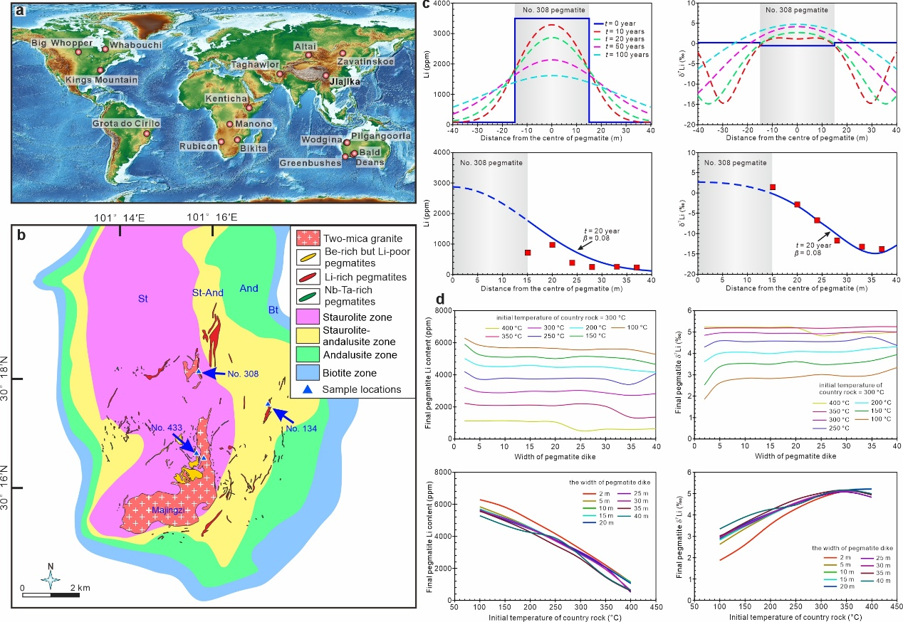 圖1 (a)全球典型偉晶巖型鋰礦床分布圖;(b)甲基卡礦區地質簡圖;(c)甲基卡礦床308號脈圍巖剖面鋰含量和鋰同位素剖面;(d)熱模擬和擴散模擬結果