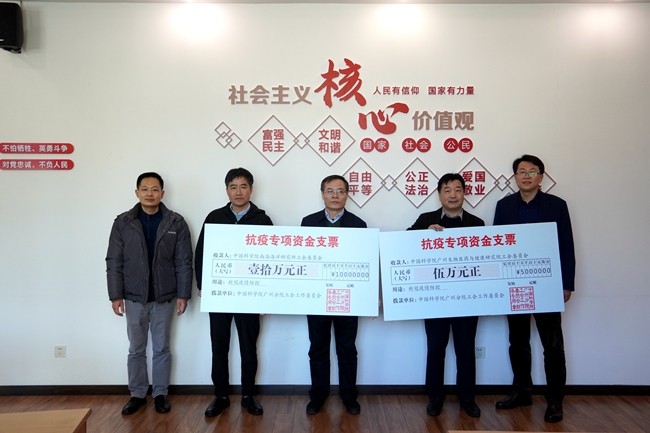 1月18日,中國科學院廣州分院舉行了簡單的抗疫專項資金撥付儀式,廣州分院分黨組書記、院長陳廣浩,副院長孫龍濤出席。中國科學院南海海洋研究所黨委書記謝昌龍、中國科學院廣州生物醫(yī)藥與健康研究院黨委副書記侯紅明分別代表本單位黨委接過支票,并對廣州分院分黨組、廣州分院工會工作委員會的大力支持表示感謝。